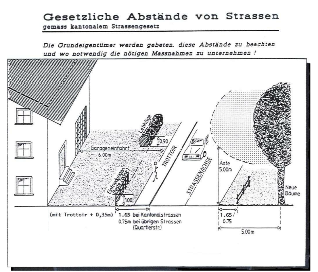 - Zu nahe an Kantonal-, Gemeinde- und Quartierstrassen gesetzte Thujahäge, Sträucher und Zäune, welche die Sicht ebenfalls stark einschränken können;